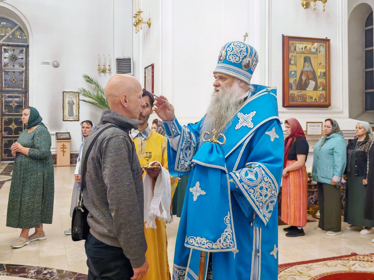 За богослужением из алтаря на середину храма была вынесена Плащаница Богородицы для поклонения верующих. Со святыней духовенство, во главе с правящим Архиереем, и прихожане прошли Крестным ходом вокруг храма.